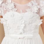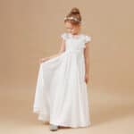 Cette robe pour une occasion singulière se distingue par sa simplicité empreinte de grâce, soulignant la beauté naturelle des petites filles lors de cette journée mémorable.